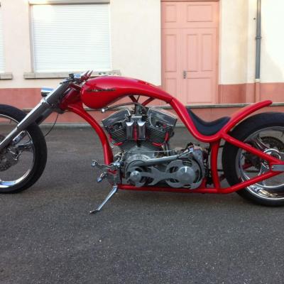 chopper pro street, revtech 110 ci, primaire BDL 3", boite 6 ultima, pneu 280/300, peinture rouge Ferrari, fourche american suspension, drag bar, tirage interne, filtre à air Spike.......